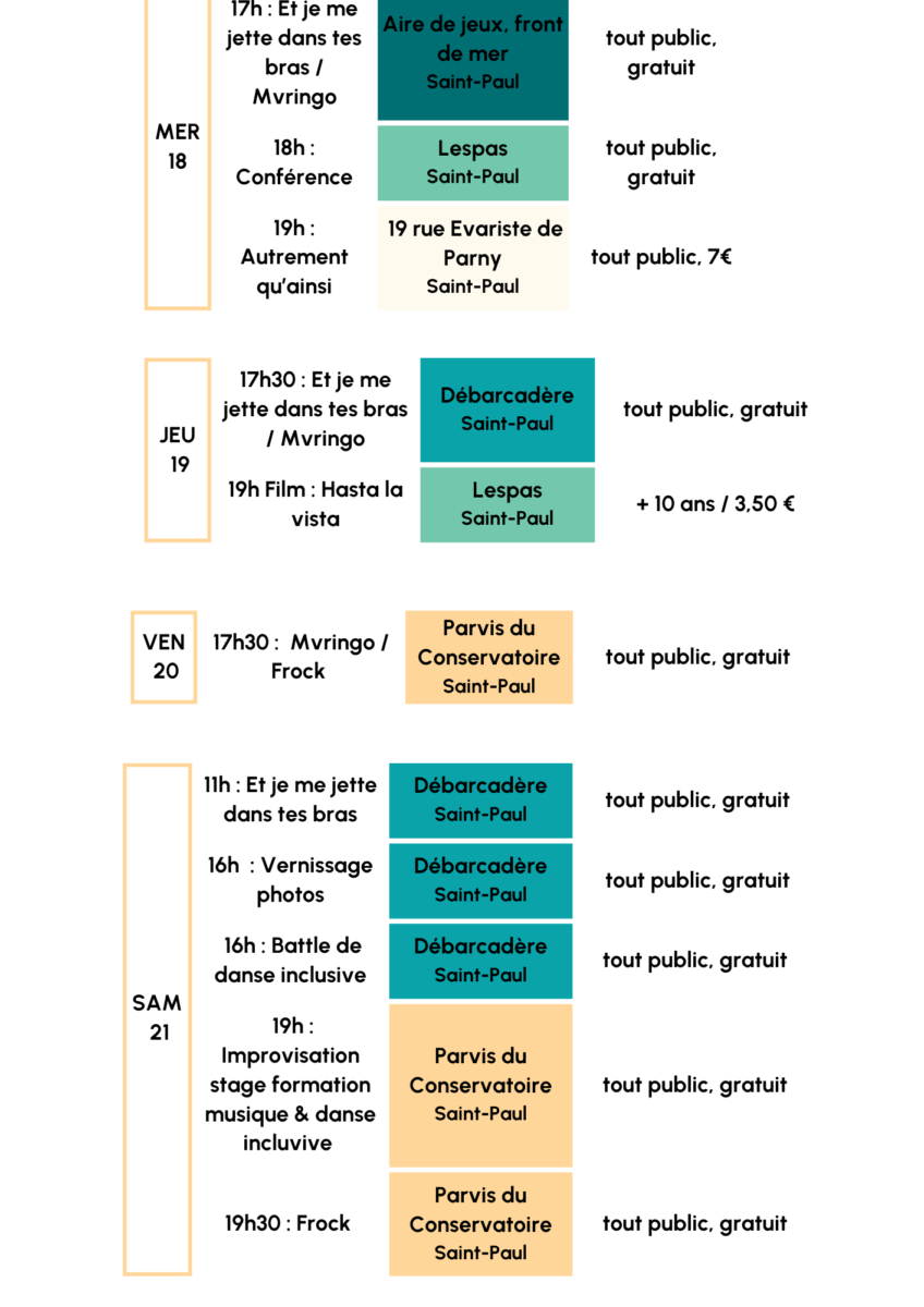 Le Festival se déroulera au cœur de la ville de Saint-Paul, investissant des espaces urbains. Pour clôturer en beauté, un village festif se tiendra du jeudi 19 au samedi 21 septembre à Léspas (Saint-Paul). «