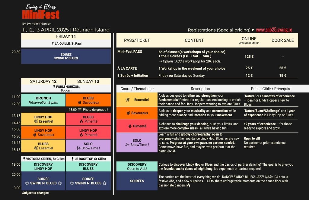 Du 11 au 13 avril 2025 un week-end inoubliable de Lindy Hop, Blues, danse Solo, Yoga/Acro-Yoga, et plus encore – tout ça ici à La Réunion !