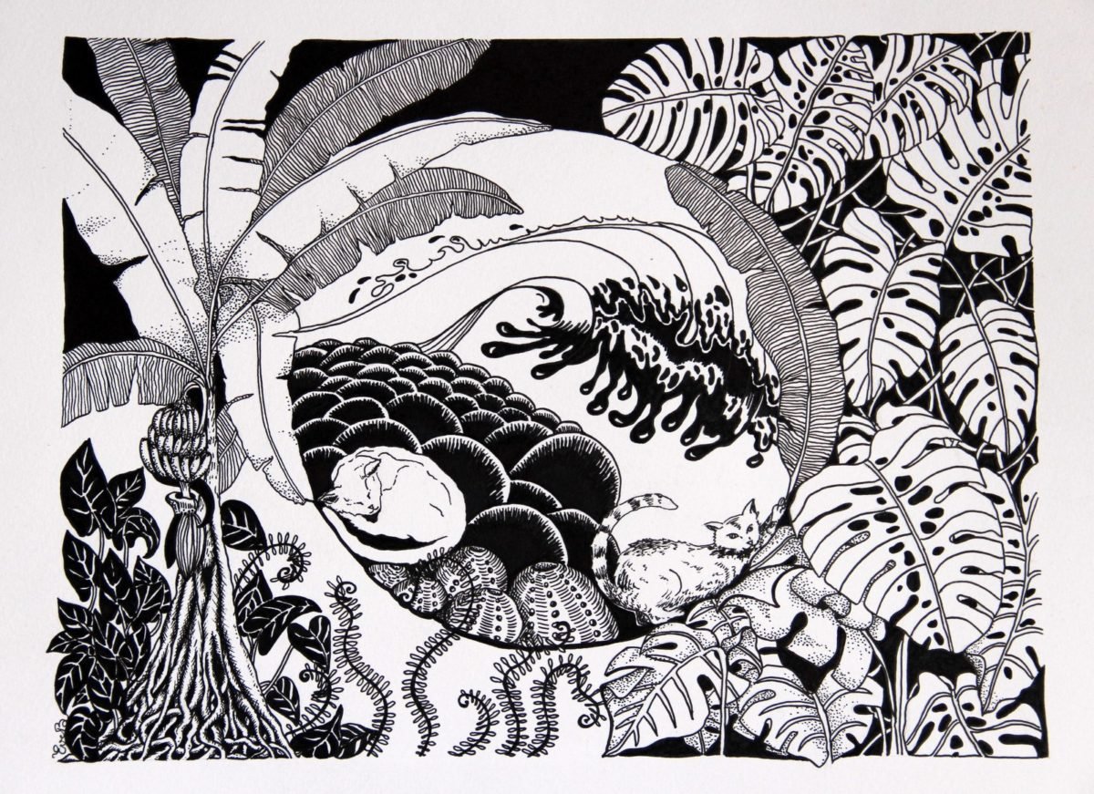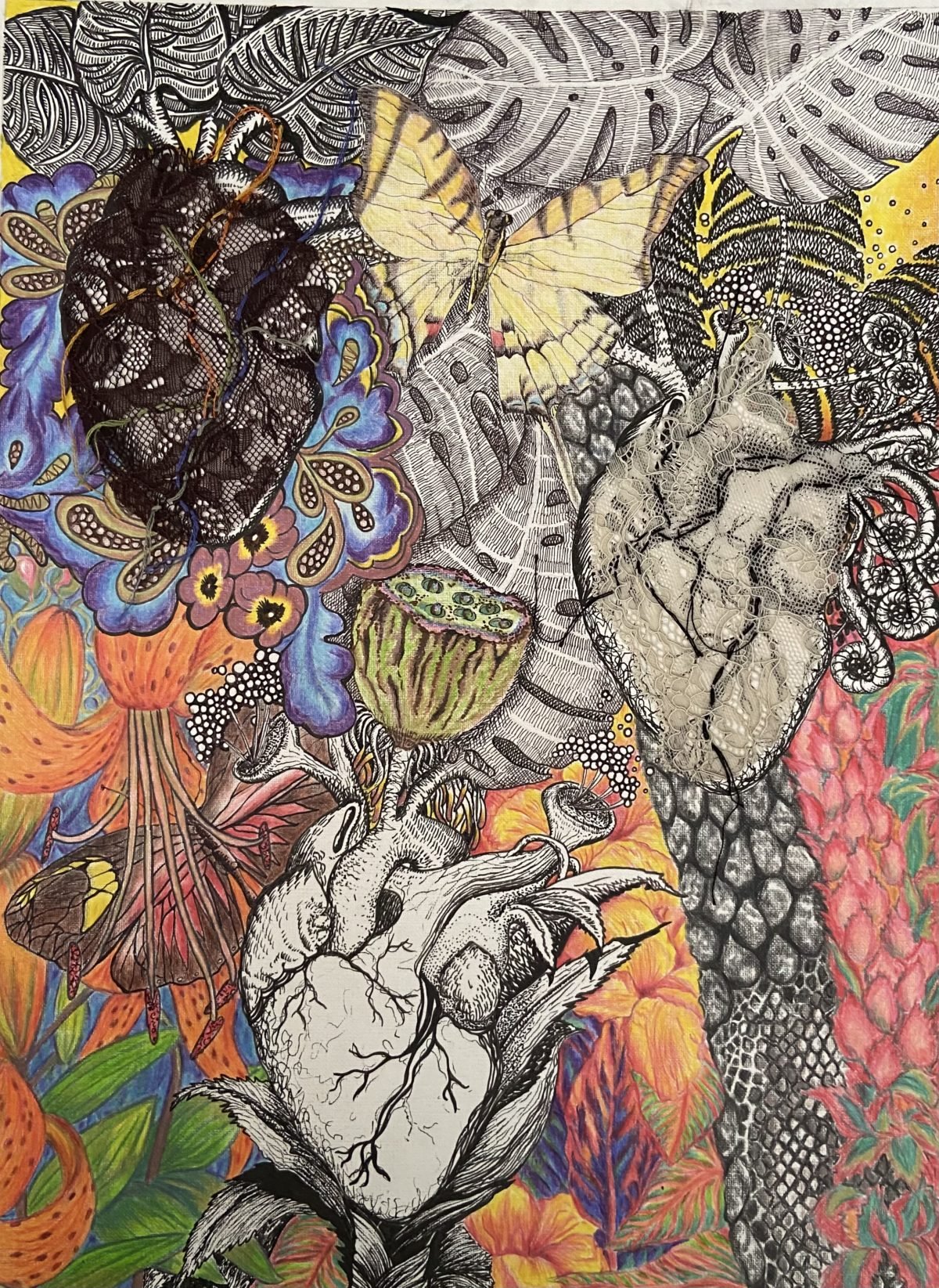 Eve Bernard, inspirée par la végétation de La Réunion, explore dans ses œuvres la relation entre l’humain et la nature. En 2022, elle décide de représenter le cœur humain, symbole universel, pour exprimer cette connexion profonde. Ses compositions mêlent éléments naturels et anatomiques, créant une dualité entre contemplation de la nature et cœur à nu. Les détails graphiques révèlent la complexité des formes et textures, soulignant la correspondance entre notre corps et la nature.