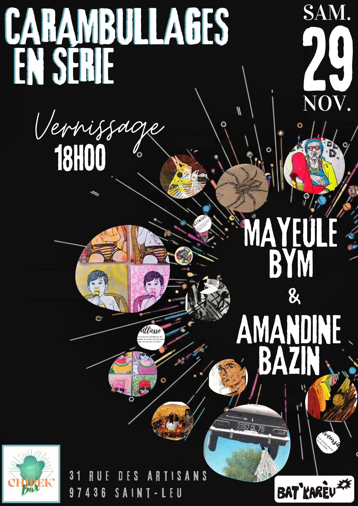 « Carambullages en série » présente le travail de Mayeule Bym – artiste graphiste, illustratrice et plasticienne, et Amandine Bazin. Deux univers riches en diversité, en couleurs et en imagination, qui se rejoignent dans la multiplicité des terrains de jeux.