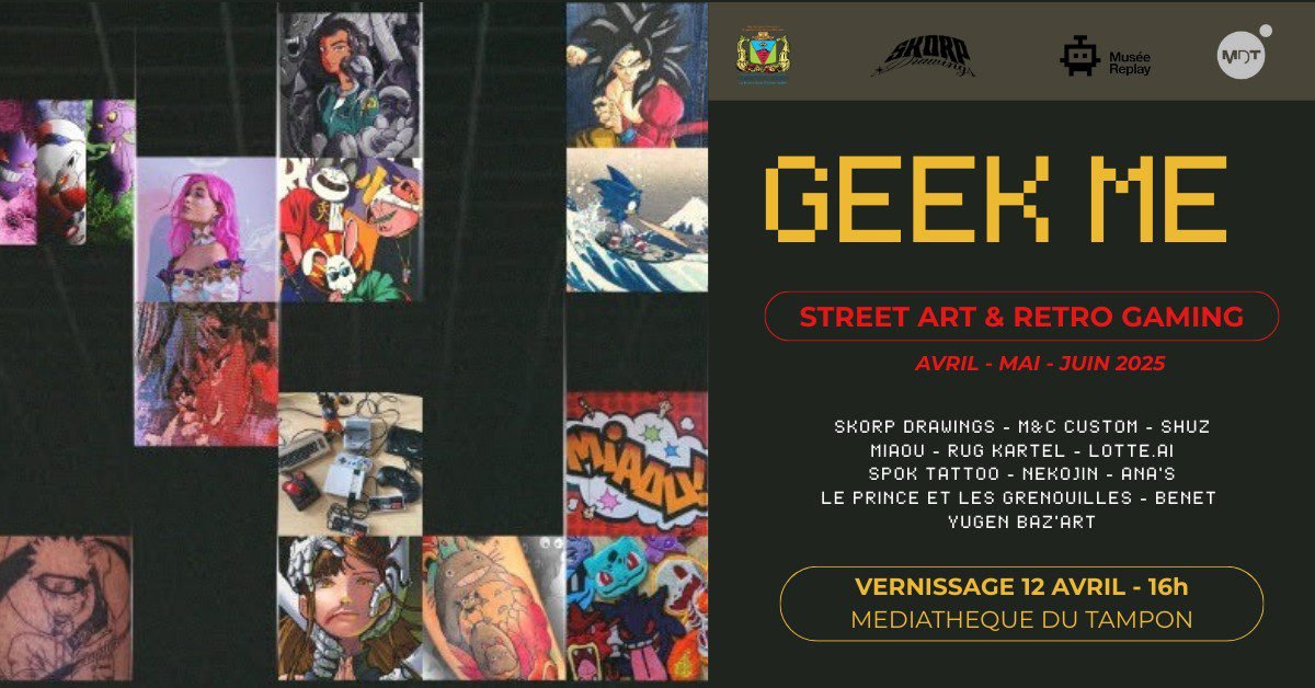 Avec l’exposition « Geek me », venez découvrir ou retrouver le plaisir de consoles qui ont marqué l’histoire du jeu vidéo (PS1, NES, Atari 2600, Commodore 64…) et plongez dans l’univers de street artistes péi qui se sont inspirés de l’univers gaming !