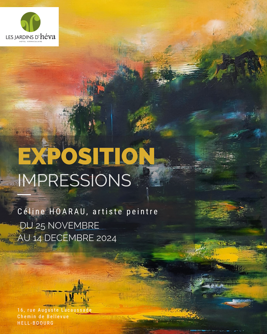 Découvrez son exposition de peinture « IMPRESSIONS » visible à l’hôtel de charme Les jardins d’Héva à Hell-Bourg jusqu’au 14 décembre 2024.