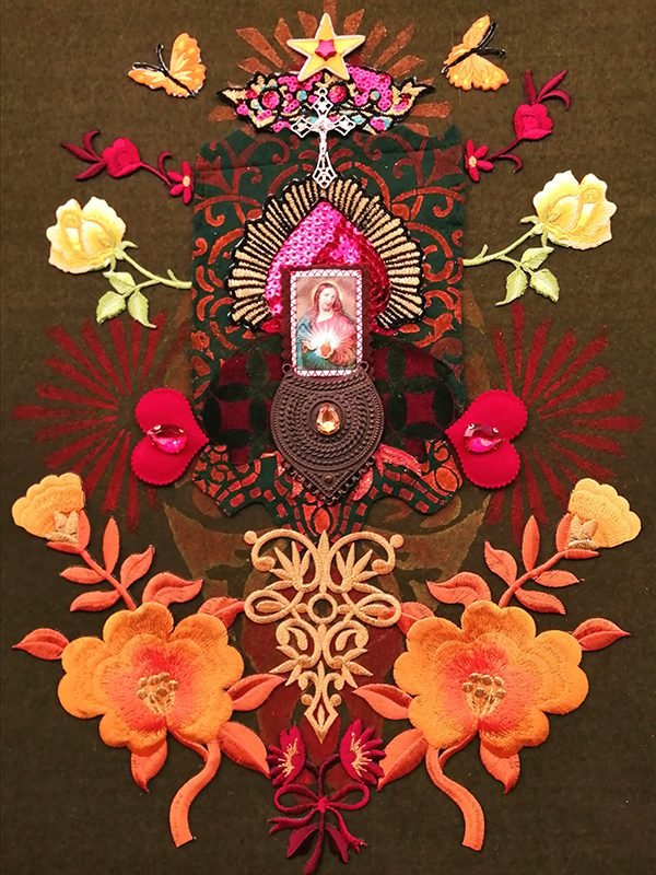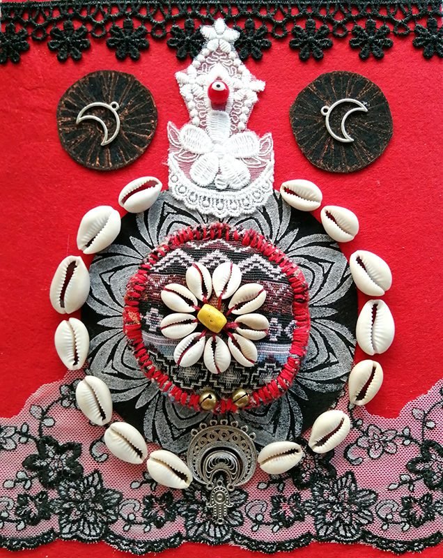 Chaque œuvre est un autel portatif, un petit temple intérieur, un espace symbolique fait de textile, d’objets rituels et de fragments soigneusement choisis.