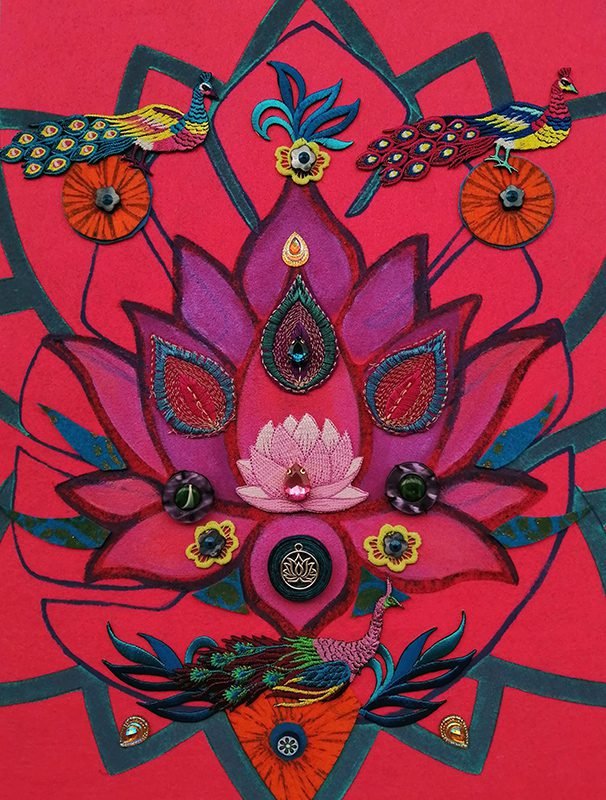 « Je compose, je colle, j’assemble, je tisse, je brode, je relie. Chaque geste devient une offrande, chaque matière un langage sensible.
