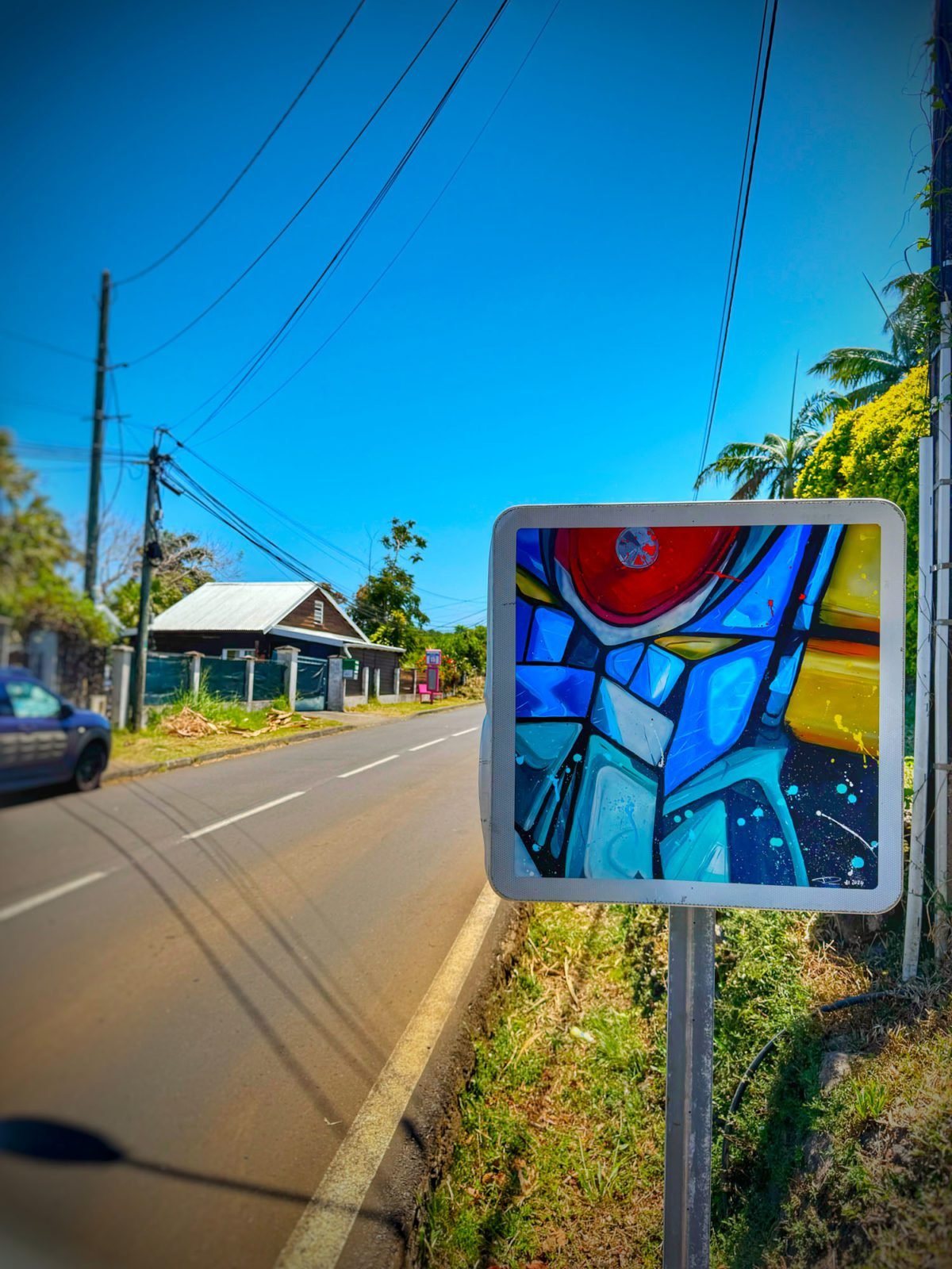 Il est aussi connu pour ses œuvres sur des panneaux de signalisation usés qu’il transforme en objets d’art. Ces supports accueillent des personnages cultes des années 80 et 2000, comme Bart Simpson, Goldorak ou Spiderman, tout en réintégrant des éléments iconiques de La Réunion dans un style cartoon unique, comme les Tétrapodes.