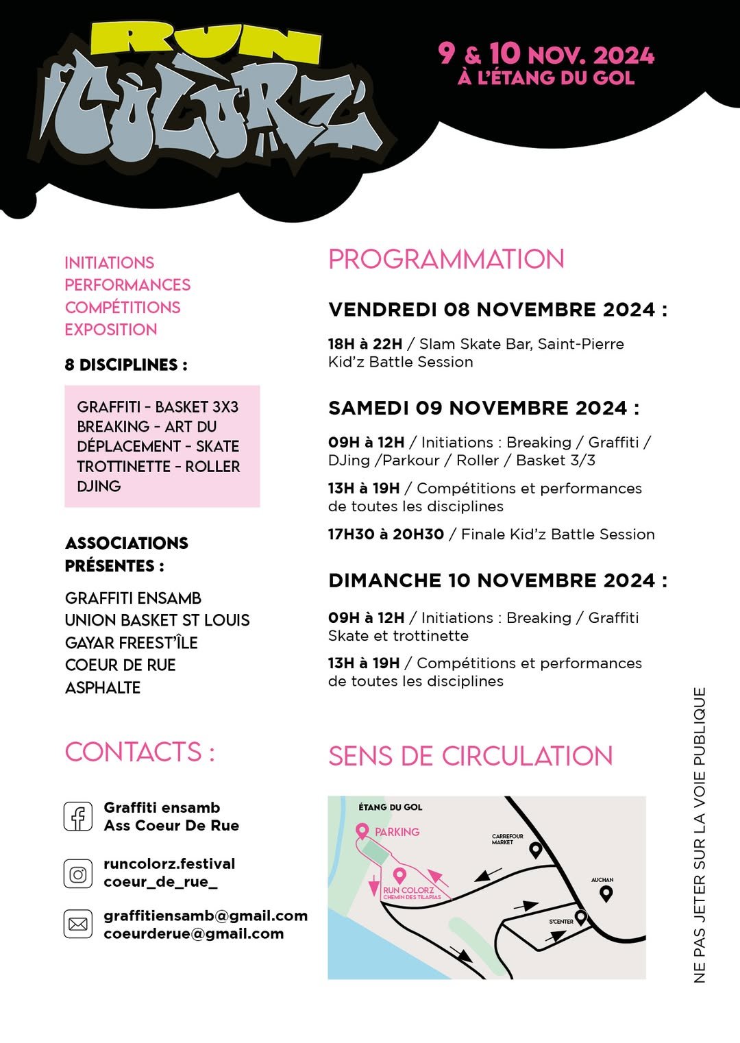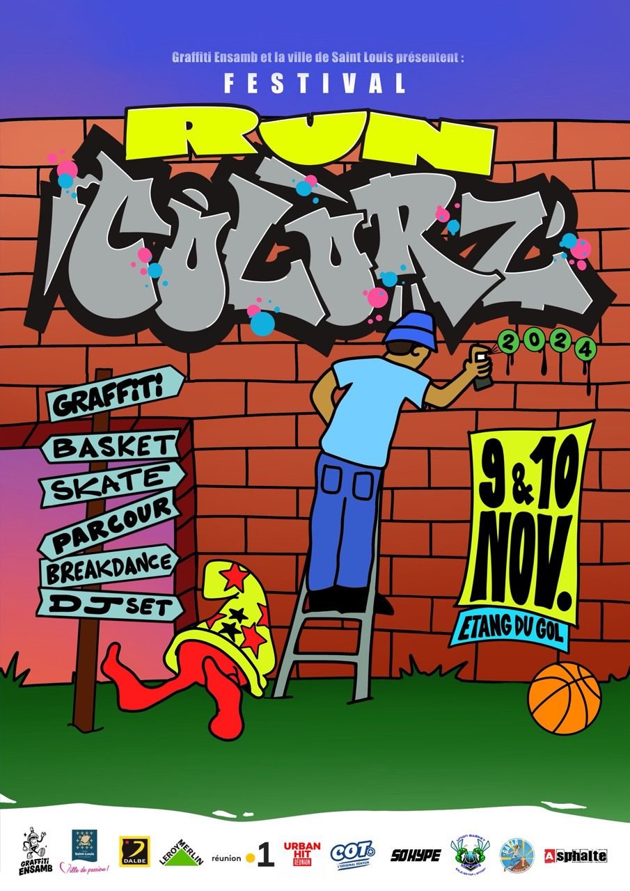 Le festival RUN COLORZ est gratuit et ouvert à tous, rassemble chaque année plus de 5000 personnes sur le weekend. Au programme : du graffiti, des sports de glisse, du parkour, du breakdance, du basket en 3×3, une exposition, des foodtruck, des initiations, compétitions et performances.