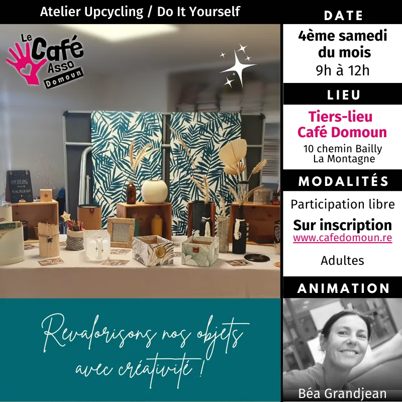 Chaque 4ème samedi du mois, de 9h00 à 12h00, inscris toi à un atelier de revalorisation d’objets.