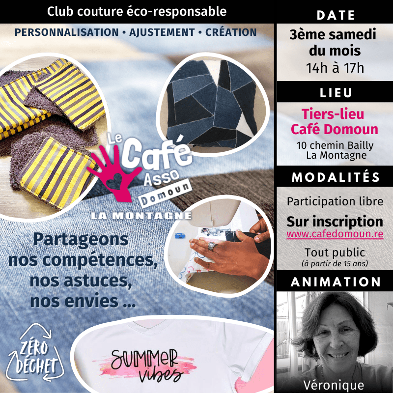 Chaque 3ème samedi du mois, de 14h00 à 17h00, rejoins le Club couture éco-responsable du Café Domoun !