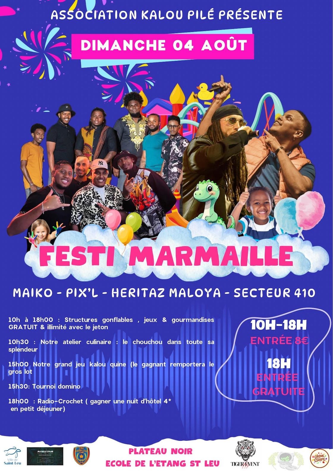 Au programme : structures gonflables, jeux en bois, chamboule-tout, tir à l’arc, pêche aux canards, course goni, maquillage pour enfants, atelier culinaire mettant à l’honneur le chouchou, notre kalou-kine, et un tournoi de domino avec de nombreux lots à gagner.