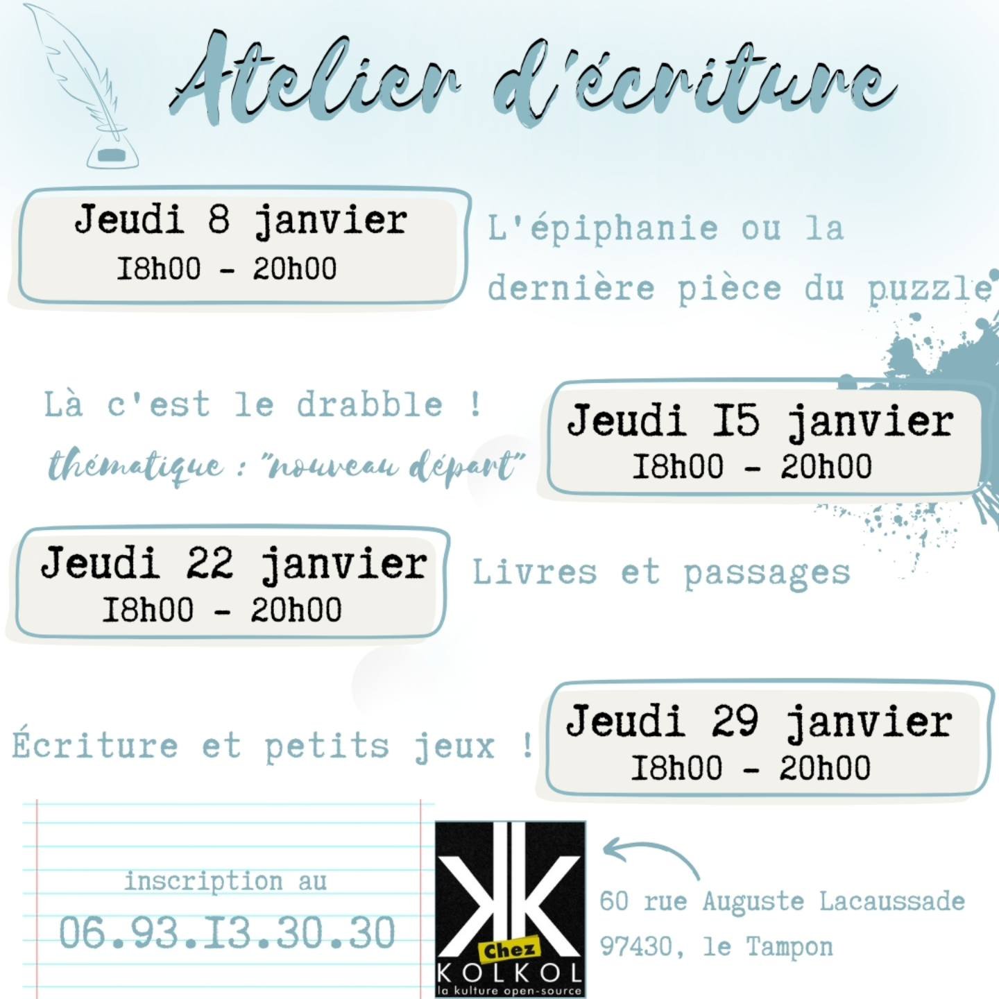 | Sud | J'écris donc jeudi | jeudi 15/01 | 18h00 | Chez Kolkol | 10 € | Enregistrer cette date |