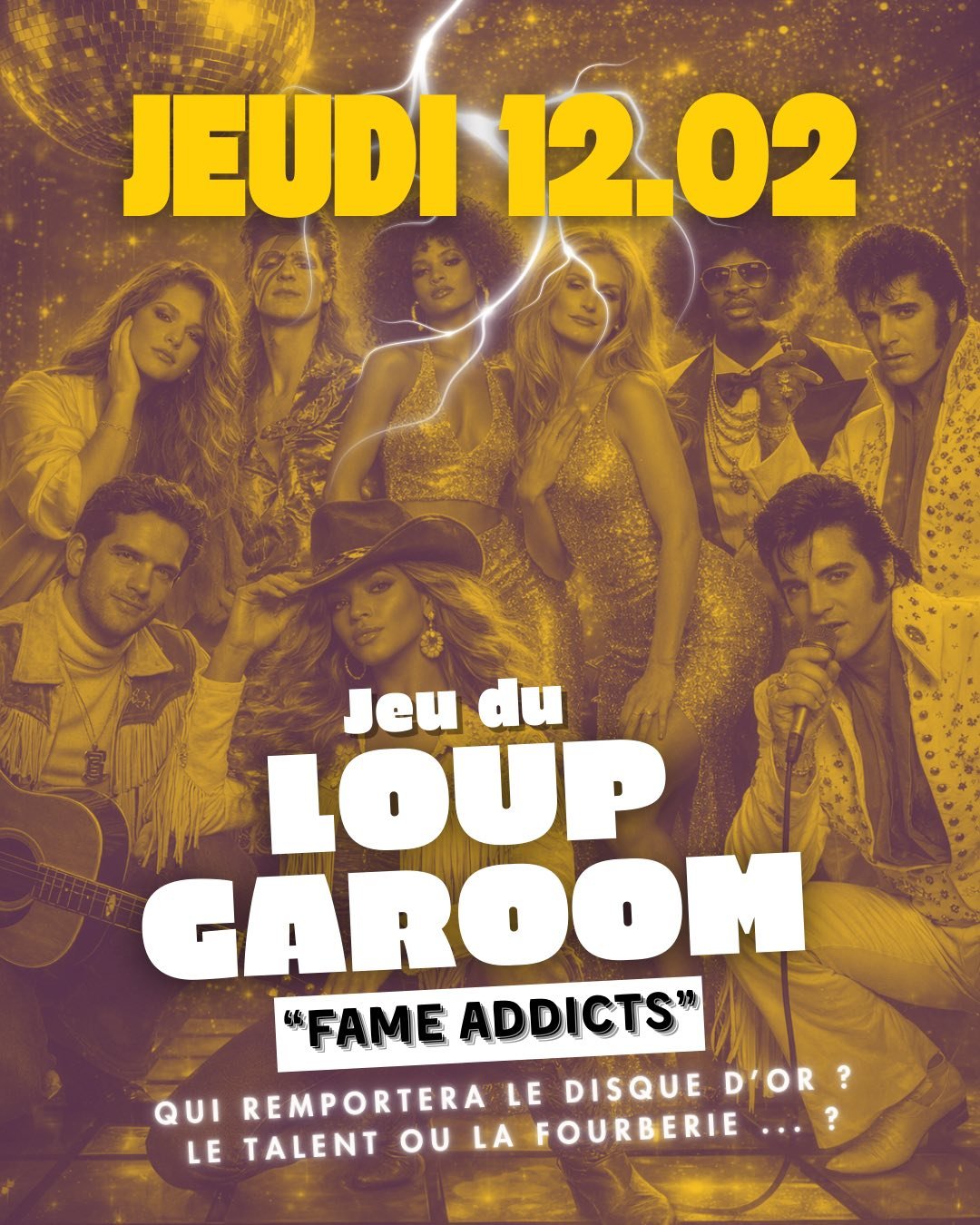 « Deux heures avant les Victoires de la Musique. Une loge. Des paillettes. Des égos surdimensionnés. Bienvenue à la première édition du Jeu du Loup-Garou, spécial Disco ! »