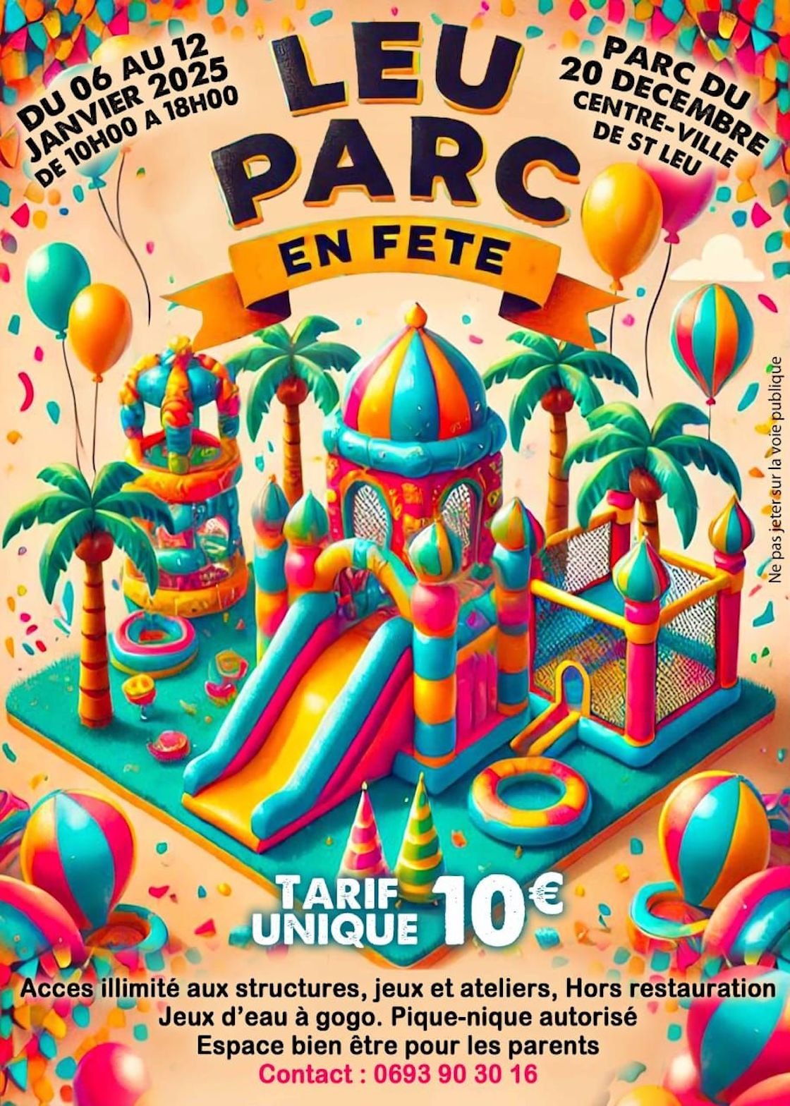 Du 06 janvier 2025 au 12 janvier 2025 de 10h à 18h au parc du 20 décembre à st Leu, venez partager des moments uniques avec vos enfants grâce à des ateliers créatifs, des structures gonflables, des jeux d’eau et un village bien-être dédié à la détente en duo