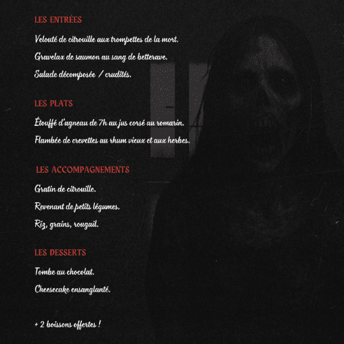 Bienvenue au bal d’Halloween ! Le restaurant Vert Tu Oses vous convie à revêtir vos plus beaux costumes d’épouvante pour célébrer la nuit où même les morts reprennent vie.