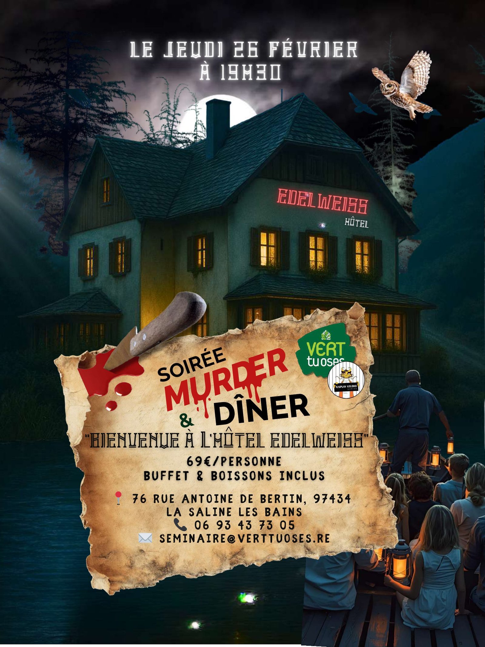 Plongez dans une soirée immersive et pleine de suspense avec « La dernière nuit à l’hôtel Edelweiss« , une murder party unique qui vous transporte dans l’ésotérisme. Imaginez un hôtel de montagne isolé, un groupe d’invités pour une soirée de commémoration festive.