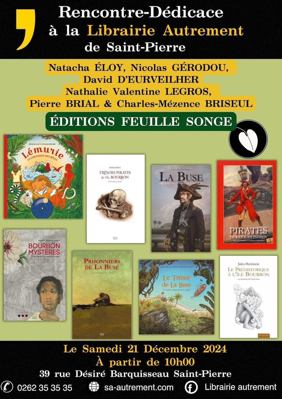 Rencontre dédicace avec Natacha ÉLOY, Nicolas GÉRODOU, David D’EURVEILHER, Nathalie Valentine LEGROS, Pierre BRIAL & Charles-Mézence BRISEUL pour « Lémurie ; le continent des rêves »; « Le trésor de la buse » ; « Bourbon Mystères » ; « La buse »; « Pirates de l’Océan Indien » ; « Prisonniers de la buse » ; « Trésors pirates de l’ile Bourbon » & « Le préhistorique à l’île Bourbon