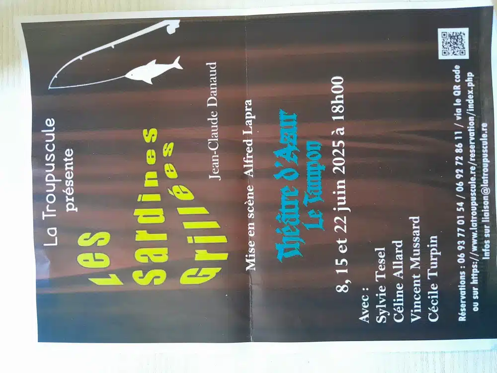 Le théâtre d’Azur du Tampon a accueilli la Troupuscule le 8 juin et va encore l’accueillir les 15 et 22 juin à 18 h pour faire découvrir à un plus large public ce groupe alliant théâtre et musique. La pièce « Les sardines grillées », écrite dans les années 80 par Jean Claude Danaud, est un vaudeville moderne et universel, qui peut rappeler aussi l’époque du Splendid, mettant en scène deux femmes complètement opposées se rencontrant dans la rue. La première, bourgeoise coincée, la seconde SDF acariâtre, d’où des dialogues et un jeu d’actrices très vifs.