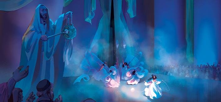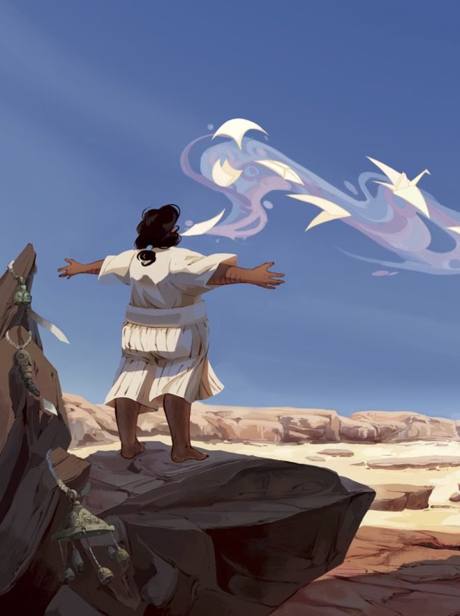 L’histoire se passe dans une ville où tout est en papier, notamment le palais où sont censés vivre les dieux. En réalité, c’est une arnaque… C’est une métaphore du fait que tout est fictif dans cet univers, un peu comme un théâtre de marionnettes ou des ombres chinoises. On croit que tout est magnifique, alors qu’en réalité c’est une supercherie, une mise en scène faite par un architecte talentueux pour extorquer les voyageurs. Visuellement, c’était aussi très intéressant de travailler avec des origamis, car ça rendait possible plein de mises en scènes et de détails poétiques.
