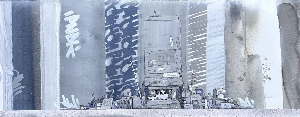 Mais sa deuxième passion, c’est le rap français. Le vieux rap français principalement, avec ses pianos, ses caisses claires qui tabassent et ses “explicit lyrics”. Il explique en écouter tout le temps en créant et cela se voit dans ses œuvres. Les pandas portent volontiers casquettes et bling bling à l’effigie du Panda World Kroo. Les murs, les cabanes ou les barricades qu’ils défendent ne sont pas à l’abri d’une nuée de tags et de coulures.