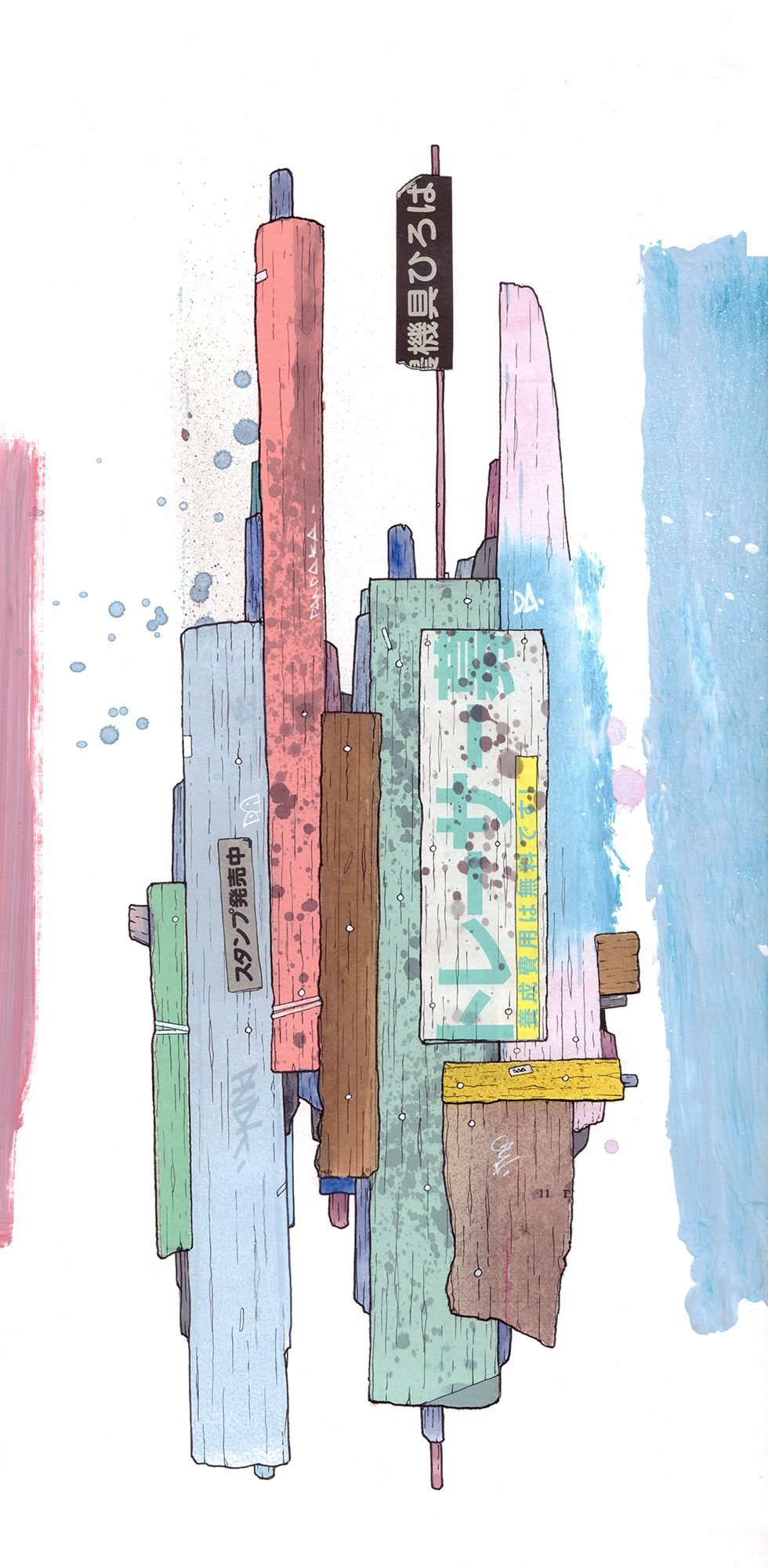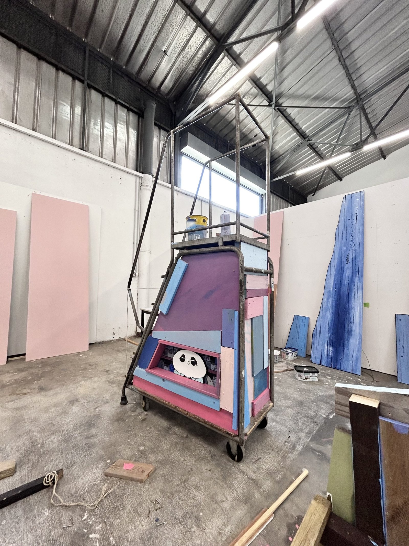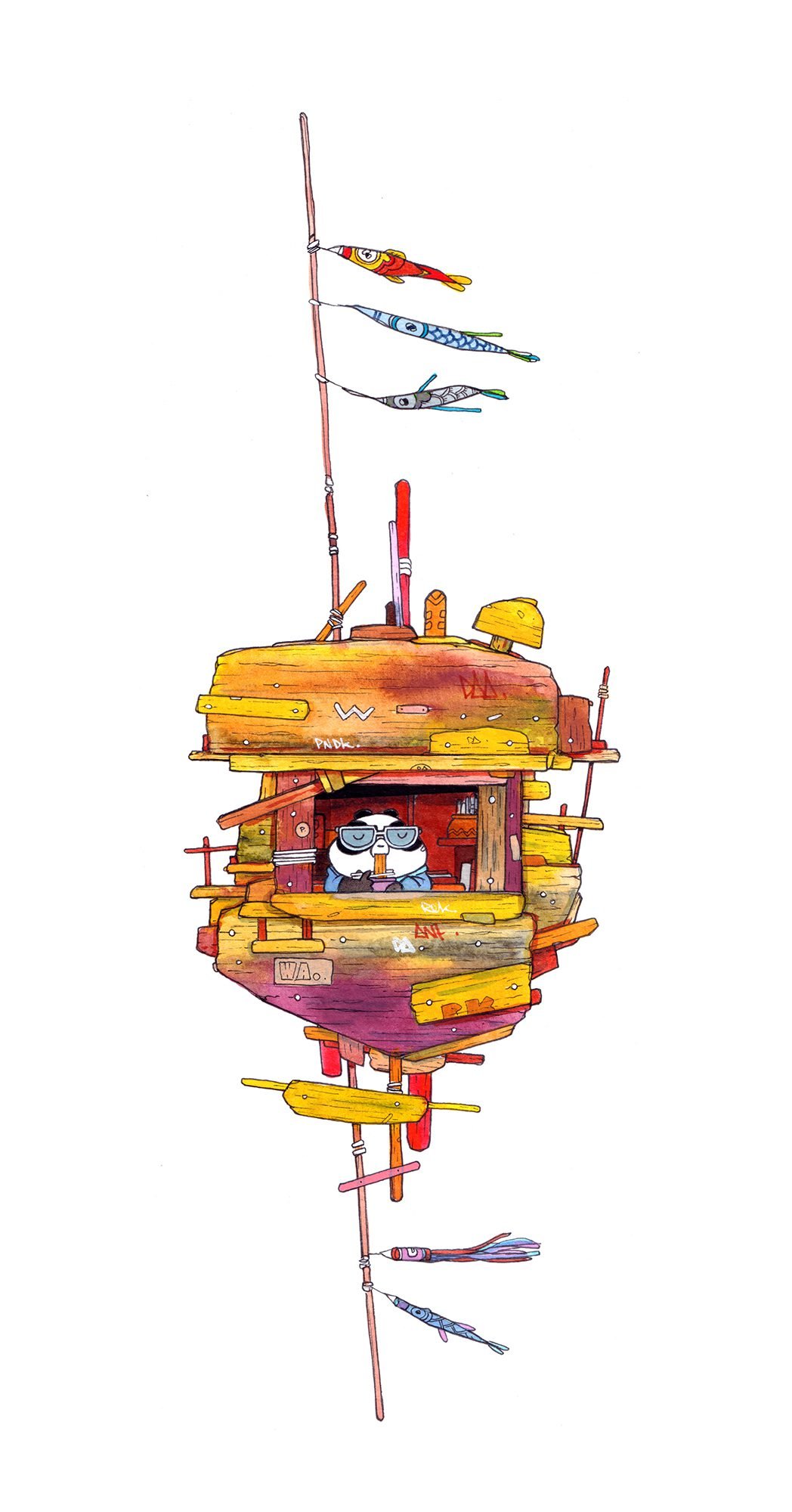 Alter egos auto fictifs de l’artiste, ils défendent les barricades de la zone artistique libre à l’aide de lances, ou de rouleaux à peinture. Dans un univers à la Mad Max, trônant sur des bâtiments faits de bric, de broc et de matériaux de récupération, seuls ou en groupe, les pandas font figure de résistance silencieuse face au vacarme du monde.