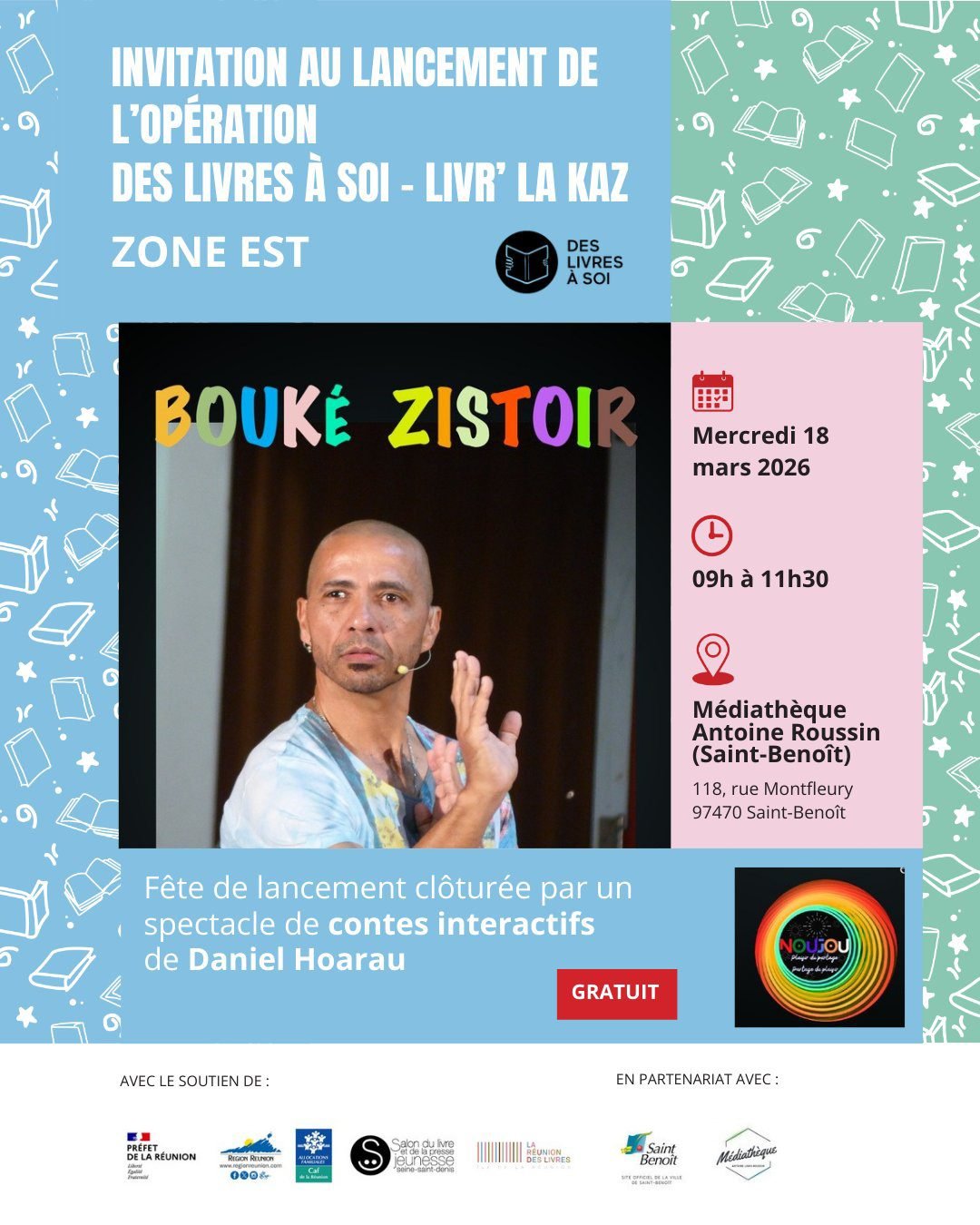 La Réunion des Livres a le plaisir d’annoncer la fête de lancement de l’opération « Des Livres à Soi – Livr’ la Kaz », organisée en partenariat avec la mission locale de l’Est.