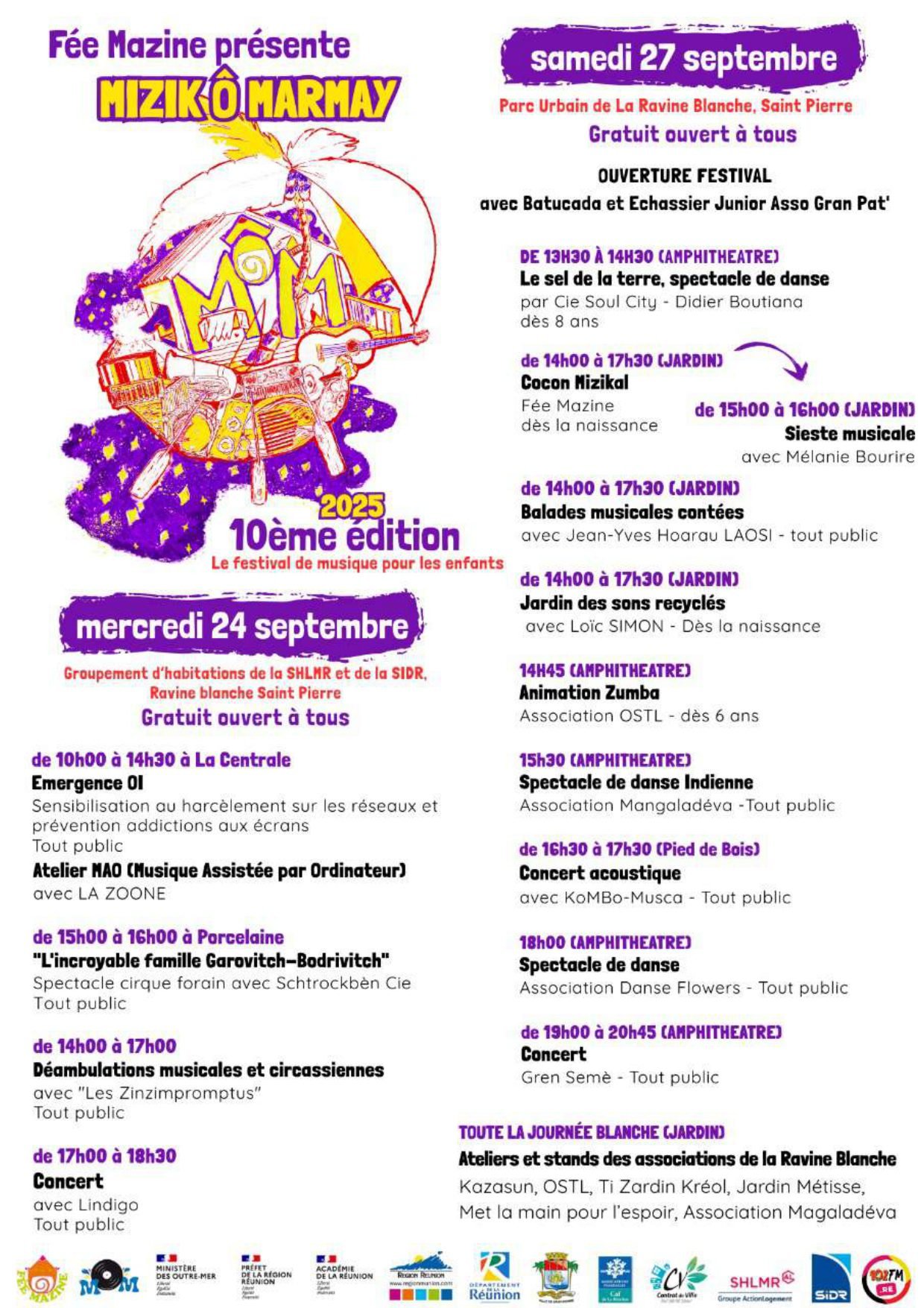 Le Festival Mizik Ô Marmay fait peau neuve et revient les 24 et 27 septembre 2025, pour une 10 ème édition rythmée, de la danse, de la musique, des spectacles, le tout dans une ambiance familiale, au cœur du quartier de la Ravine Blanche, à Saint Pierre.