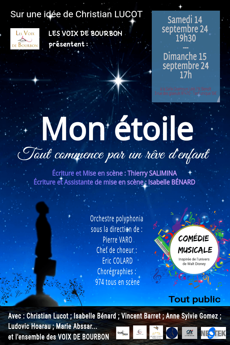 Une Comédie Musicale créée par Les Voix de Bourbon , » Mon Etoile » avec plus de 25 chansons des plus grands dessins animés de Walt Disney , autour d’une idée originale de Christian Lucot. Des danseurs de la compagnie 974 tous en scène, plus de 30 chanteurs des Voix De Bourbon, l’orchestre Polyphonia de Saint André dirigé par Pierre Varo, des comédiens et solistes dont Anne Sylvie Gomez, Ludovic Horeau, Vincent Barret, Claudie Abounassar, Christian Lucot, Isabelle Bénard . 70 personnes sur scène et en orchestre!! ..Ecriture et Mise en scène Thierry Salimina et Isabelle Bénard, Chef de choeur et Direction Eric Colard , chef d’orchestre Pierre Varo