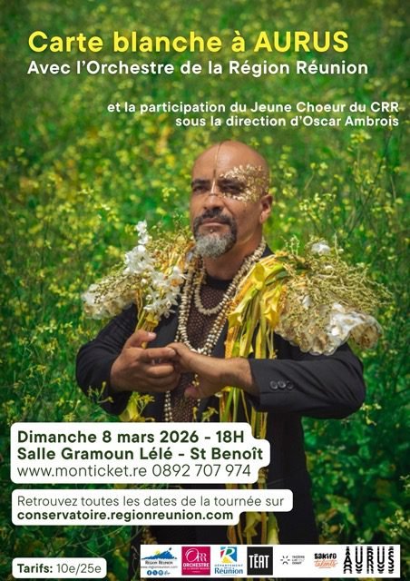 Aurus, artiste à l’allure de shaman, transporte à lui seul par ses performances scéniques puissantes et compose polyphoniquement avec sa voix, mêlant chants en anglais et en créole. Soutenu par un orchestre symphonique d’exception, ce concert promet d’être une expérience sensorielle envoutante.