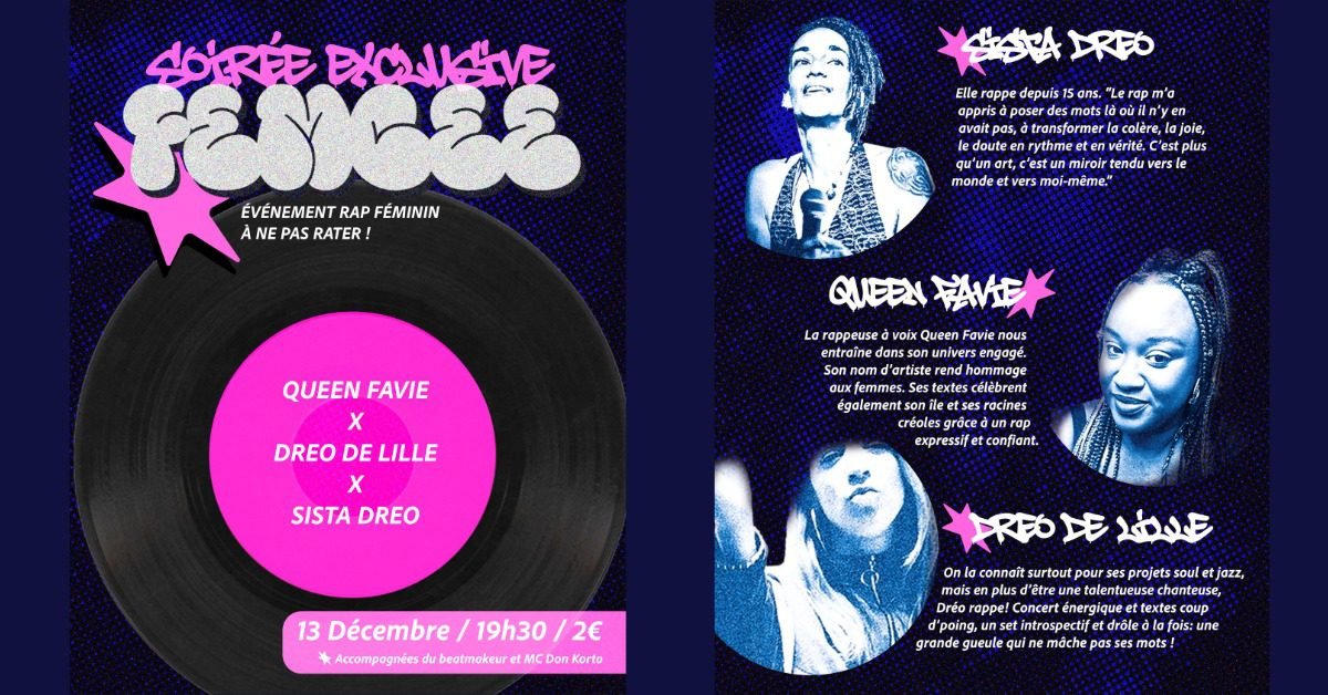 4 ans après leur rencontre qui avait donné lieu à un enregistrement, Queen Favie, Sista Dréo et Dréo de Lille se retrouvent pour partager leur amour du rap, et mêler leur flow et leurs textes pour un medley. Pour cette création exclusive, elles seront accompagnées par le beatmakeur et MC Don Korto.