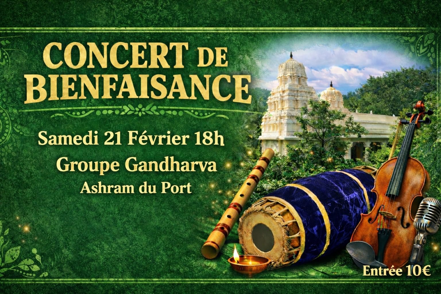 Le groupe de musique indienne Gandharva vous invite à un concert de bienfaisance le samedi 21 février 2026 à 18h, à l’Ashram du Port (4 allée Mahatma Gandhi, Le Port).