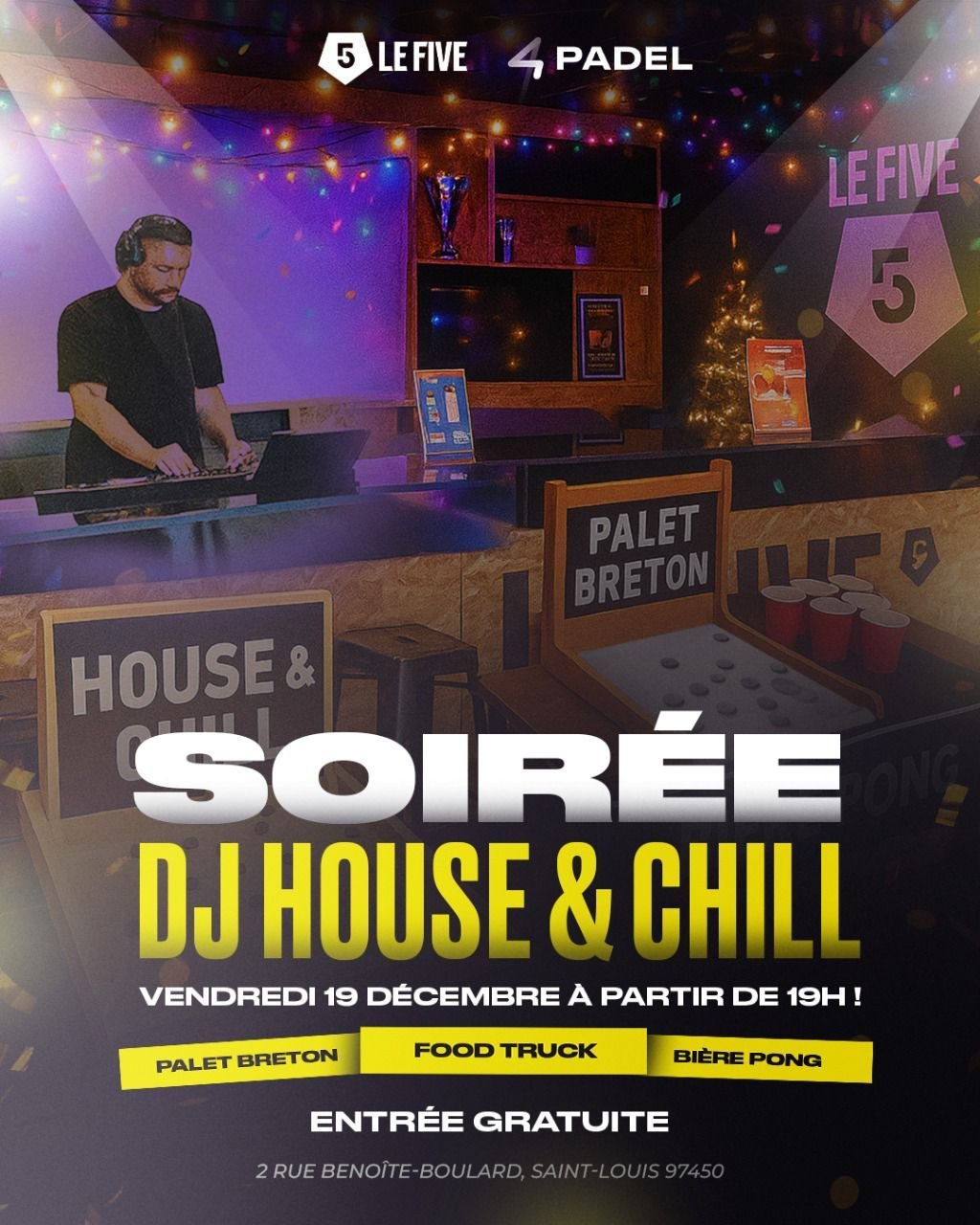 Rendez-vous vendredi 19 décembre à partir de 19h au FIVE & 4PADEL Sud Réunion pour une soirée House & Chill qui va enchaîner les bonnes vibes