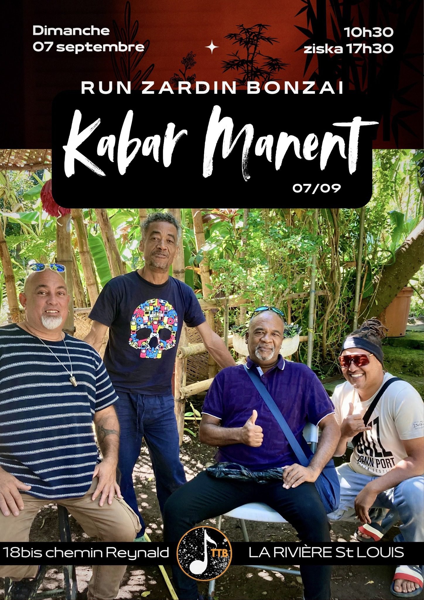 Le bann’ dalon Patrick Manent i organiz in gayar zourné èk la mizik an pagay lo dimansh 7 septembr depwi 10h30 ziska 17h30 la rivièr sin lwi : Run zardin bonzai.