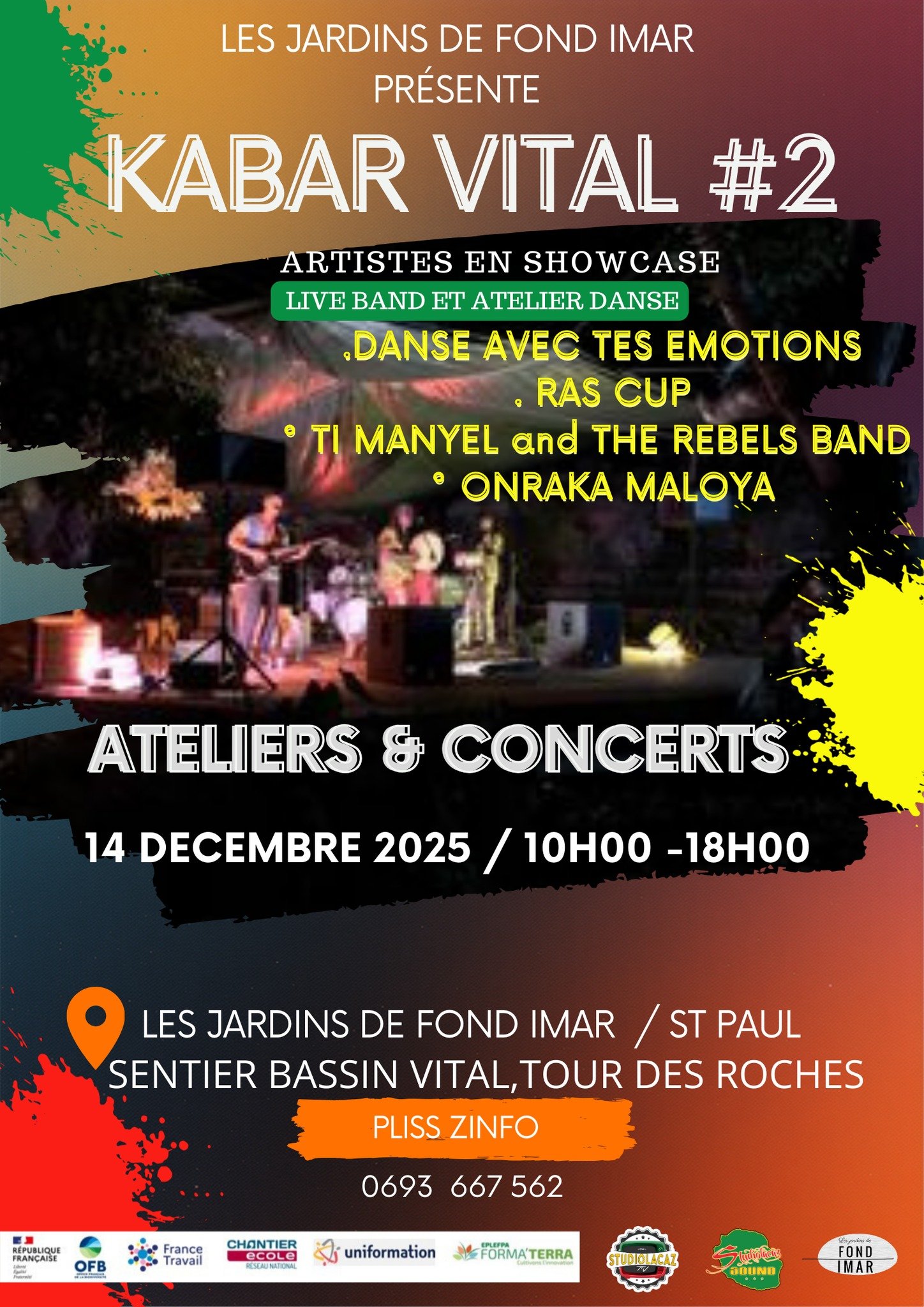 Les Jardins de Fond Imar ont le plaisir de vous inviter à la 2ᵉ édition du Kabar Vital, une journée dédiée à la culture, à la musique et à l’expression corporelle, le dimanche 14 décembre 2025, de 10h à 18h, à Saint-Paul – Sentier Bassin Vital, Tour des Roches.