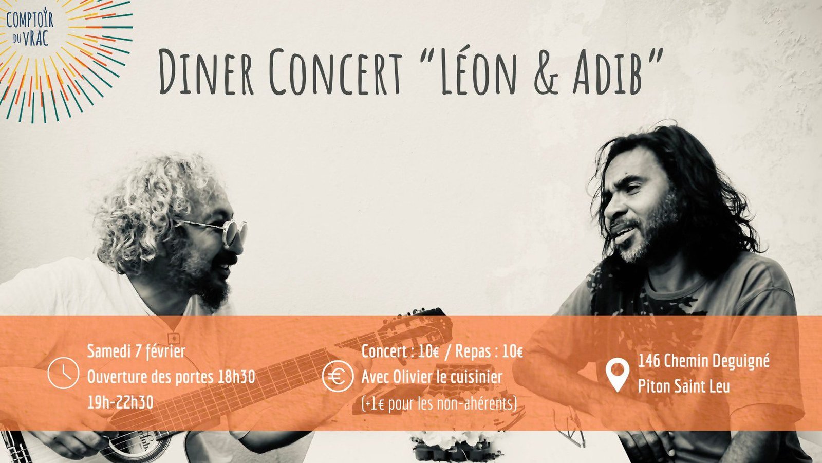 Mettez deux chanteurs et une guitare dans une grosse marmite. Ajouter un verre de bossa, une pincée de jazz, quelques gouttes d’improvisation, un zeste de fragilité et beaucoup d’émotions. Laisser mijoter. Voilà ce qu’on vous propose de déguster lors de cette soirée concert avec Adib et Jean Lou