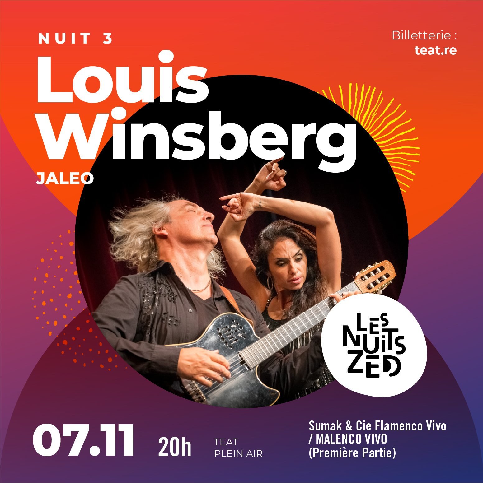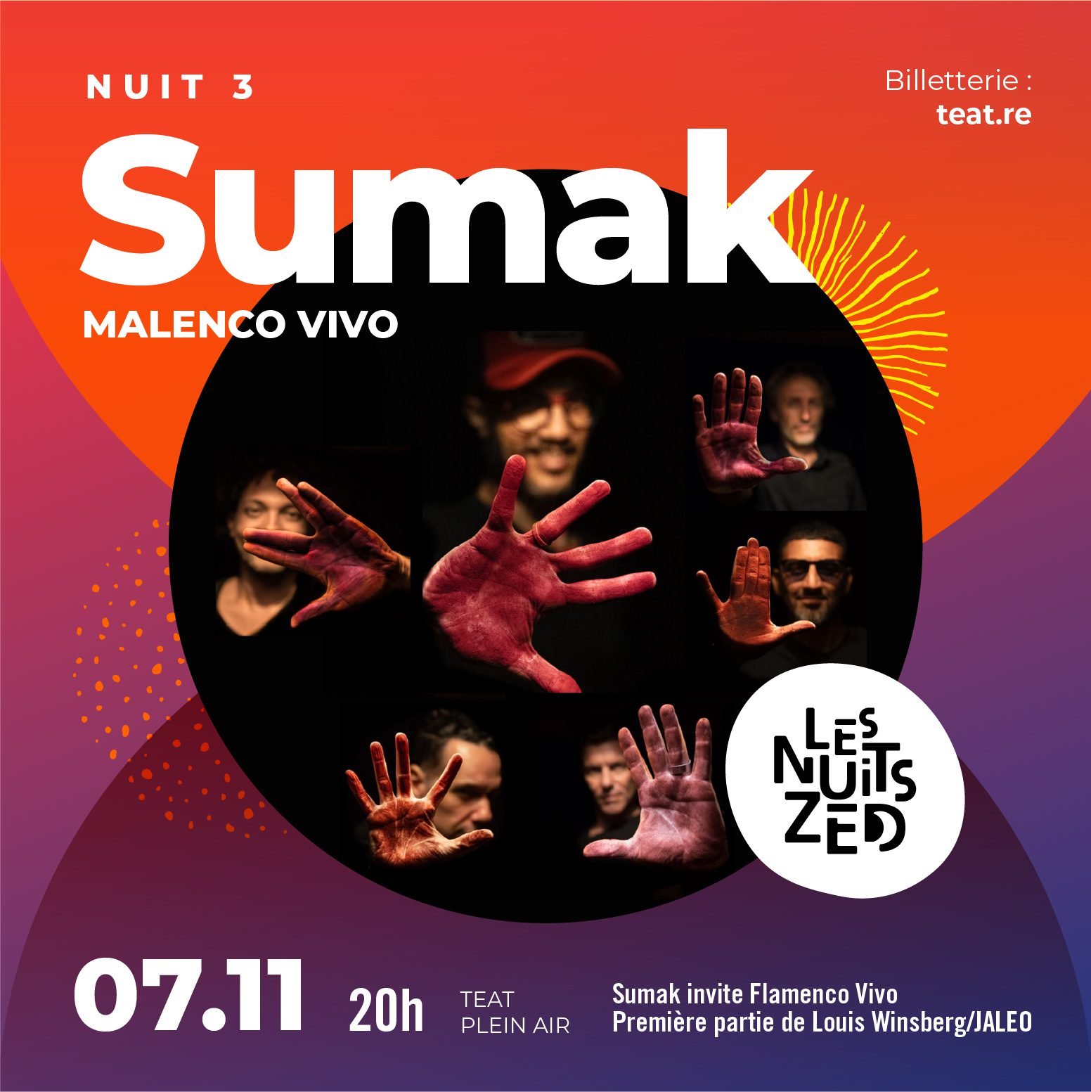 Nourri par une soif intacte de liberté, ce flamenco devient une musique sans frontières, portée par une énergie collective. En ouverture de soirée, le collectif réunionnais Sumak donnera le ton avec son projet Malenco Vivo ; fusion flamboyante pour une musique métisse aux accents maloya et flamenco.