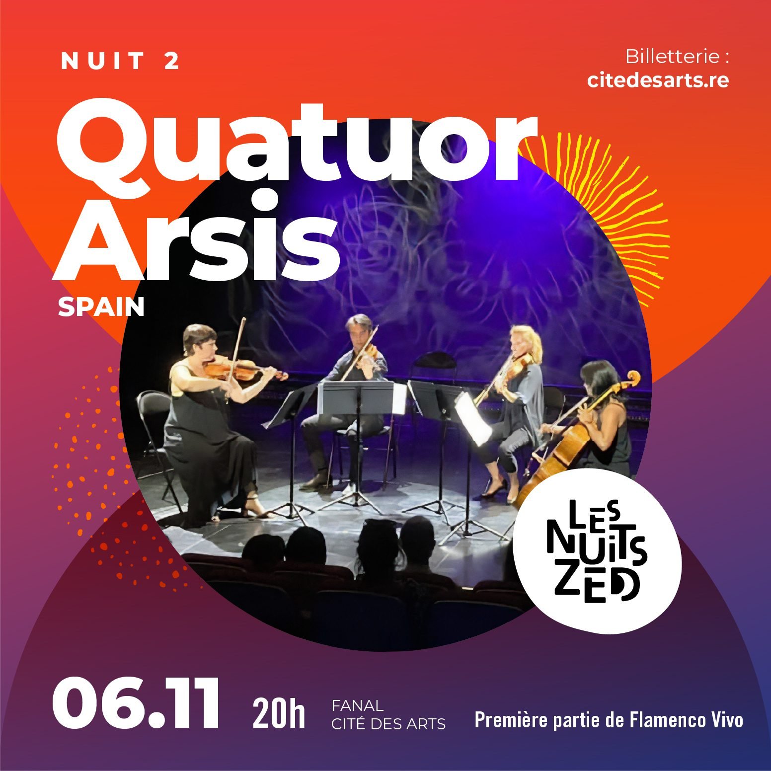 Dans cette nouvelle création, la Cie Flamenco Vivo présente la vision et le ressenti de l’Art Flamenco sur trois générations. 1ère partie assurée par le Quatuor Arsis avec un récital inédit, spécialement créé pour l’événement, autour du livret espagnol « Spain ».