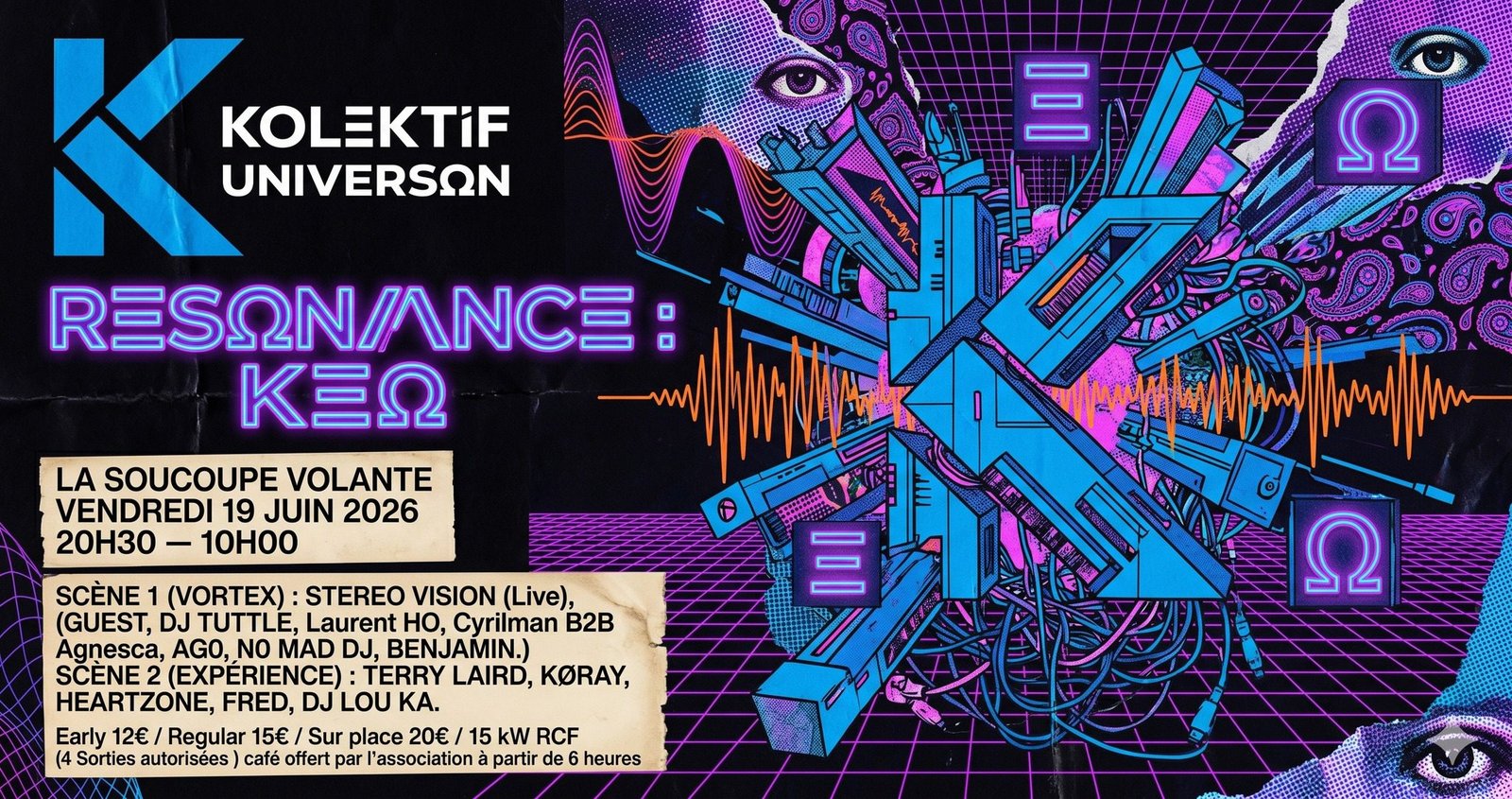 L’ÉQUIPE KEO : Autour d’eux, une sélection pointue de 14 artistes (Stereo vision en Live, Agnesca B2B Cyrilman, No Mad DJ, DJ Lou Ka, Køray…) pour couvrir tout le spectre, de l’acid à l’organique.