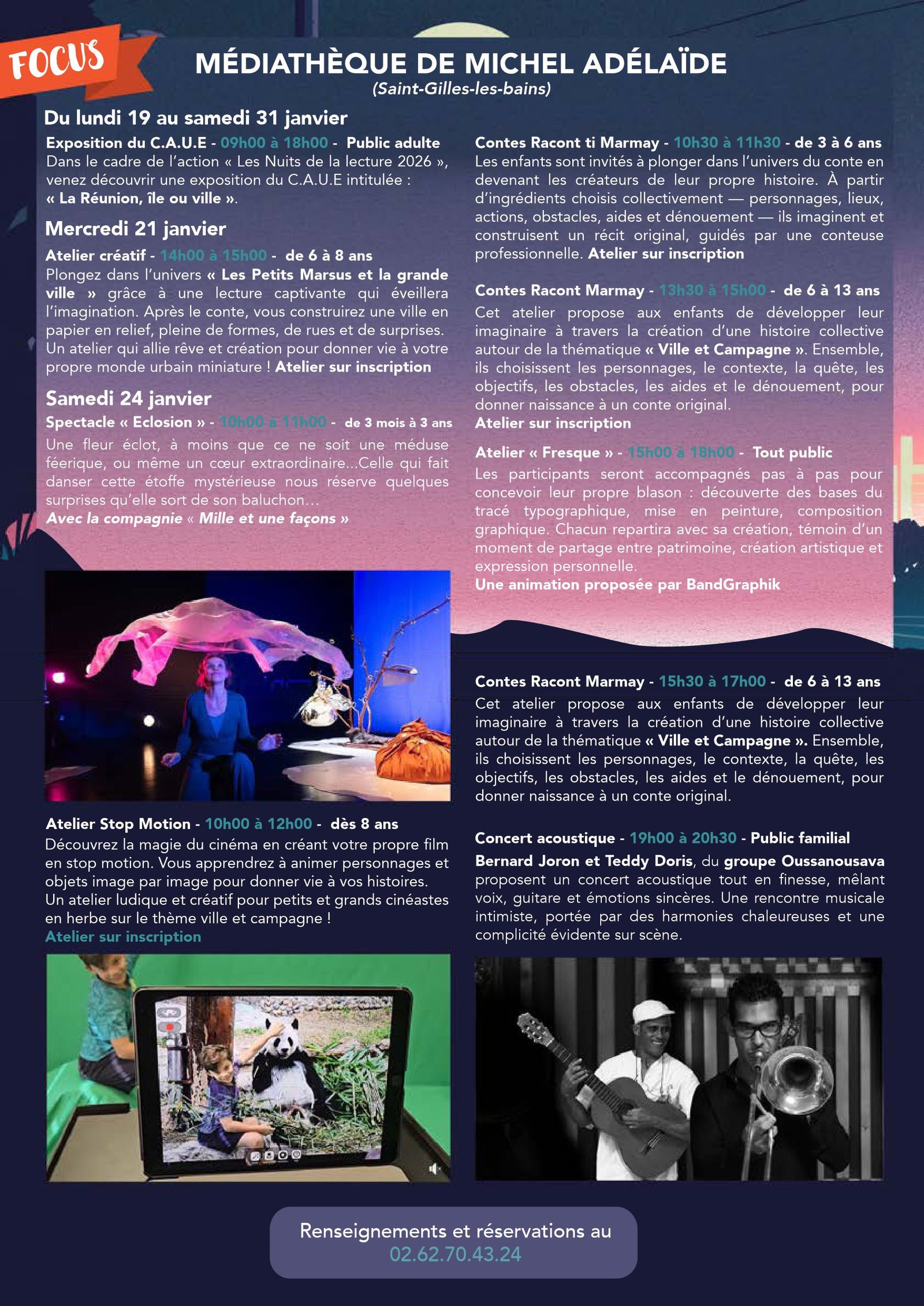 Cette année, la médiathèque de Saint-Gilles-les-Bains sera particulièrement à l’honneur avec de nombreuses animations : contes, fresque géante, concerts et bien d’autres surprises !