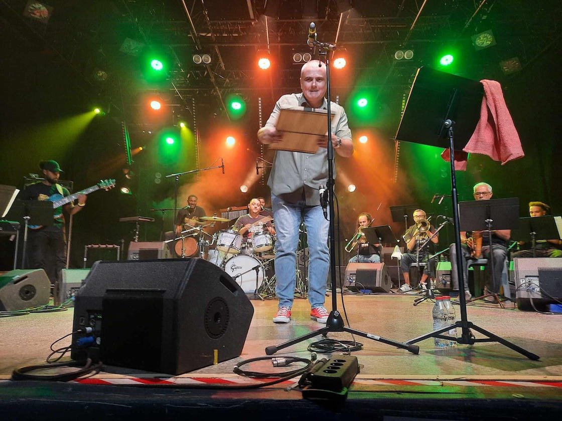 Ultimaloya, c’est le maloya de Stéphane Grondin, dit Boné, fondateur de Mélanz Nasyon, « en mode ultime ». Soit un véritable big band rassemblant 12 musiciens sur scène, dont la crème du jazz péi (Johan Saartave, Alain Chane, Meddy Gerville, etc.). Un supergroupe tout neuf donc, réuni pour porter une vision singulière fidèle à la fougue et à l’énergie du maloya, auquel s’ajoutent de nouvelles dimensions mélodiques en puisant jusque dans les musiques dites savantes (violoncelle et alto). Mais c’est surtout dans la note bleue qu’Ultimaloya plante le drapeau créole en s’appuyant sur une puissante section de cuivres.