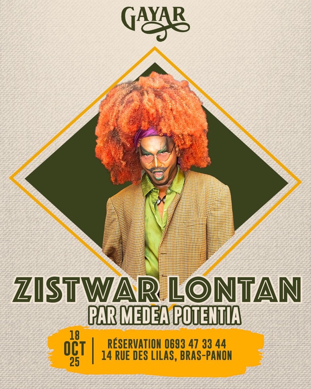 Medea Potentia est artiste drag réunionnais depuis près d’un an et créateur de l’événement « Zistwar Lontan ». Son objectif, faire découvrir et rendre accessible la culture réunionnaise par le biais du spectacle drag.